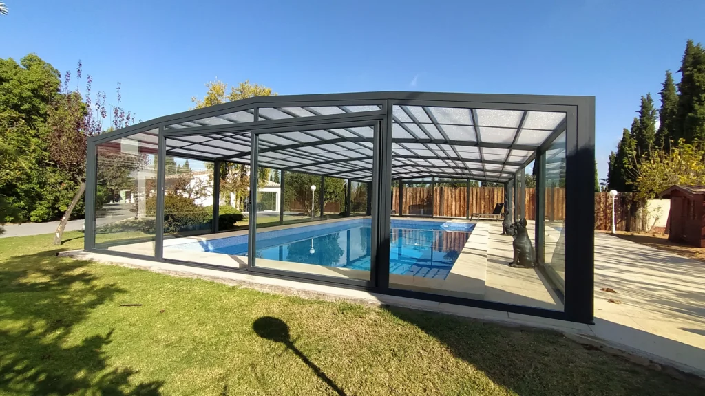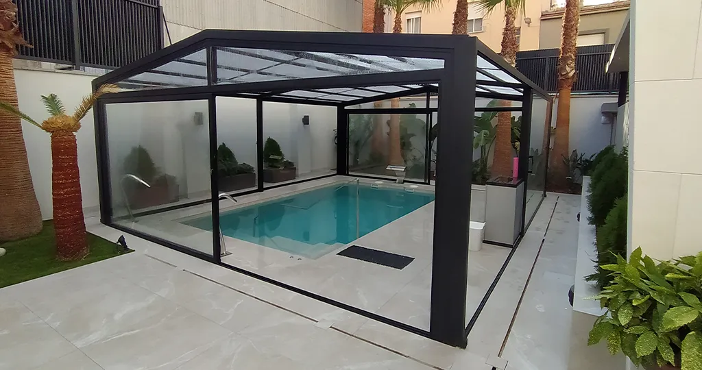 La cubierta telescópica sin carriles optimiza la experiencia de uso de la piscina al permitir su descubrimiento total, dejando el suelo completamente libre de obstáculos gracias a su deslizamiento mediante ruedas. Está fabricada con robustas estructuras de aluminio en configuración de cinco ángulos, lo que le confiere una notable fortaleza estructural capaz de alcanzar considerables dimensiones tanto en anchura como en longitud. Esto resulta en un espacioso interior habitable, ideal para satisfacer las necesidades de clientes con piscinas de gran tamaño o aquellos colectivos como comunidades de vecinos, hoteles, campings, casas rurales, entre otros.