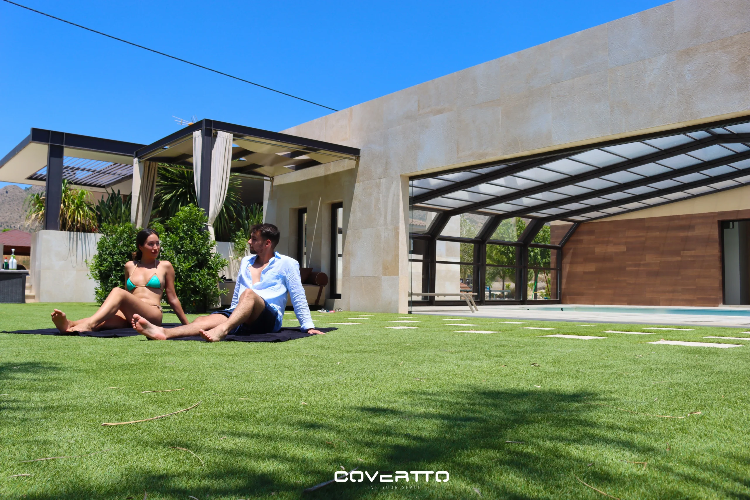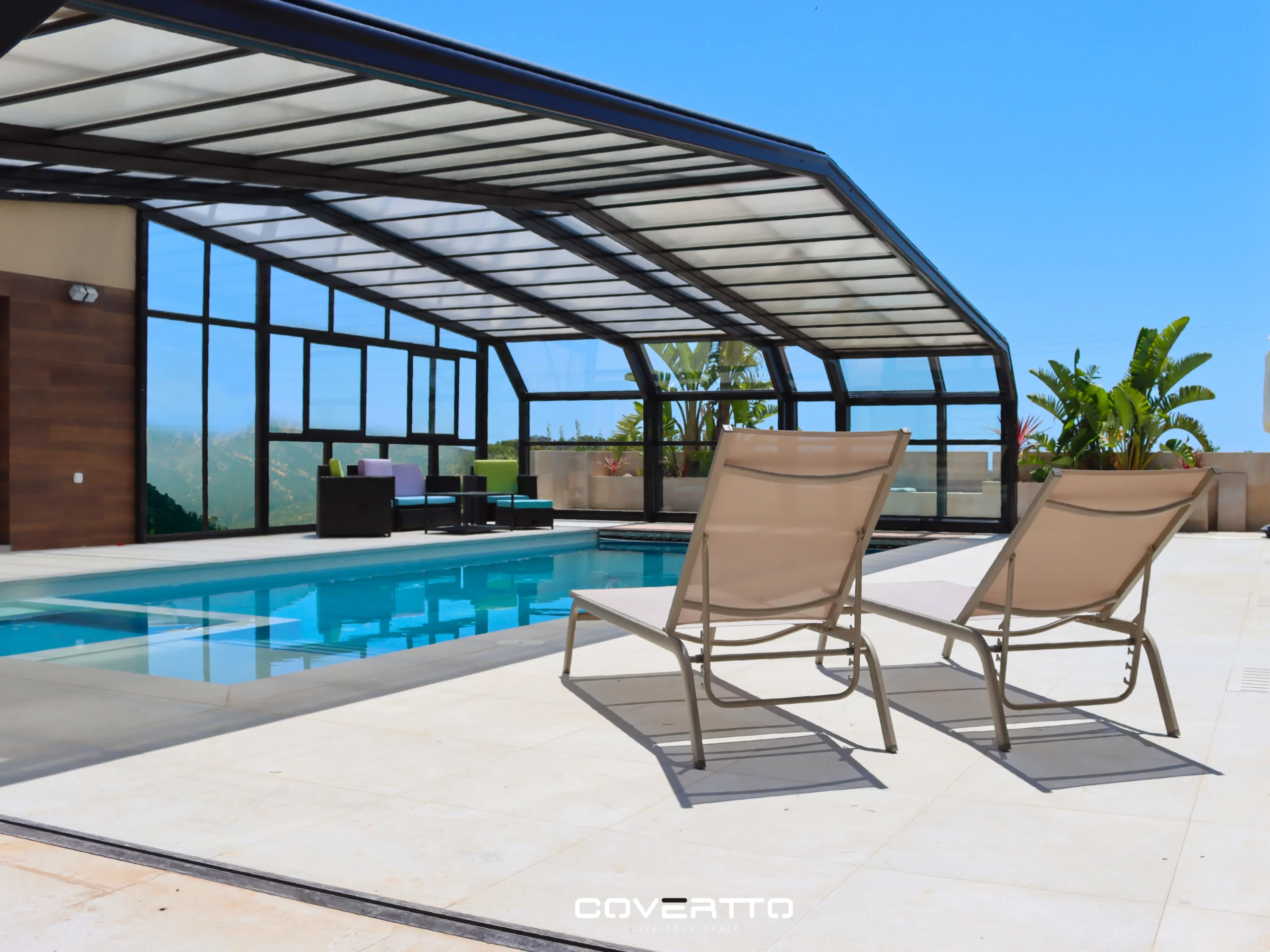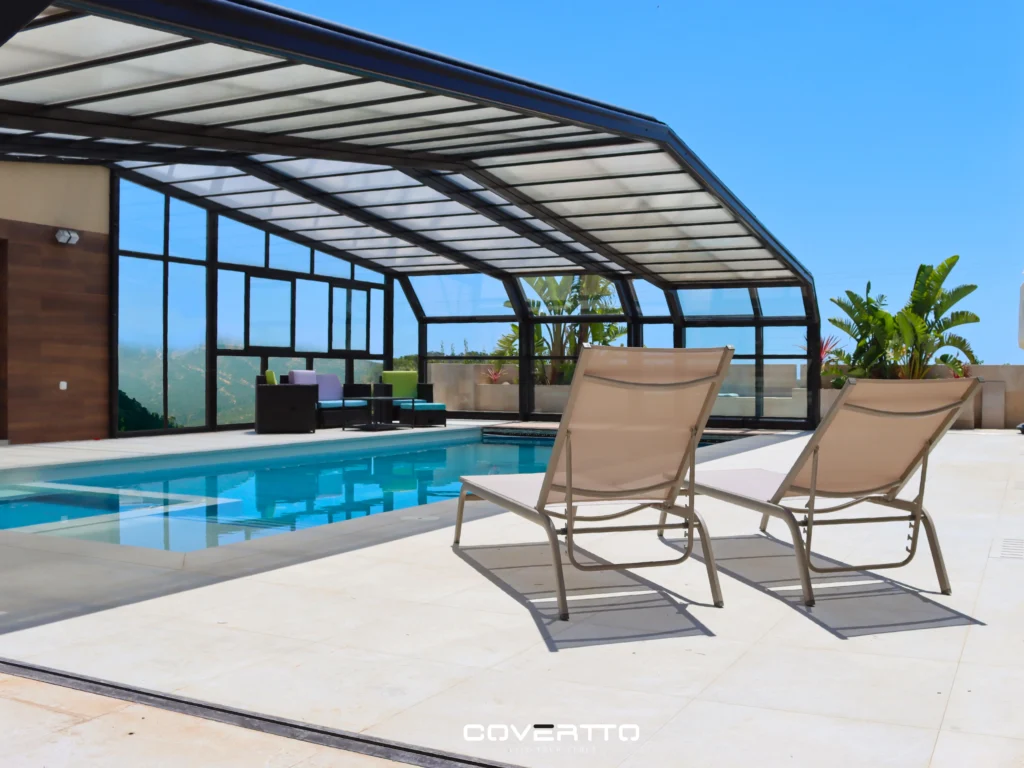La cubierta ITALICA está disponible en dos variantes de acabados de alta calidad: policarbonatos de última generación y vidrio laminado de seguridad, dirigido a clientes más exigentes en busca de una mayor durabilidad. Su sistema de apertura, que puede ser tanto manual como motorizado, permite la inclusión de una amplia gama de accesorios opcionales, como cortinas de cristal, iluminación LED, puertas tipo acordeón, entre otros, ampliando así las posibilidades de personalización.